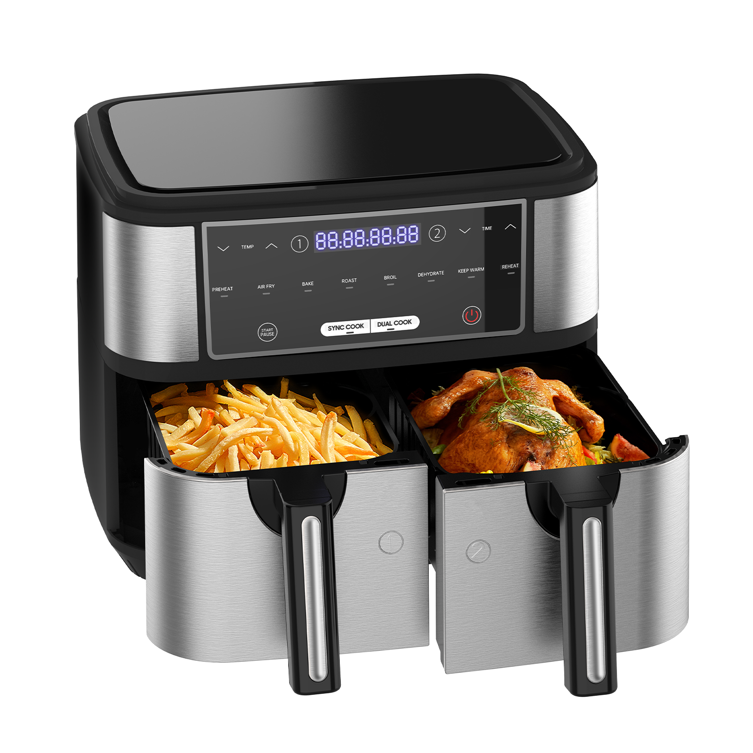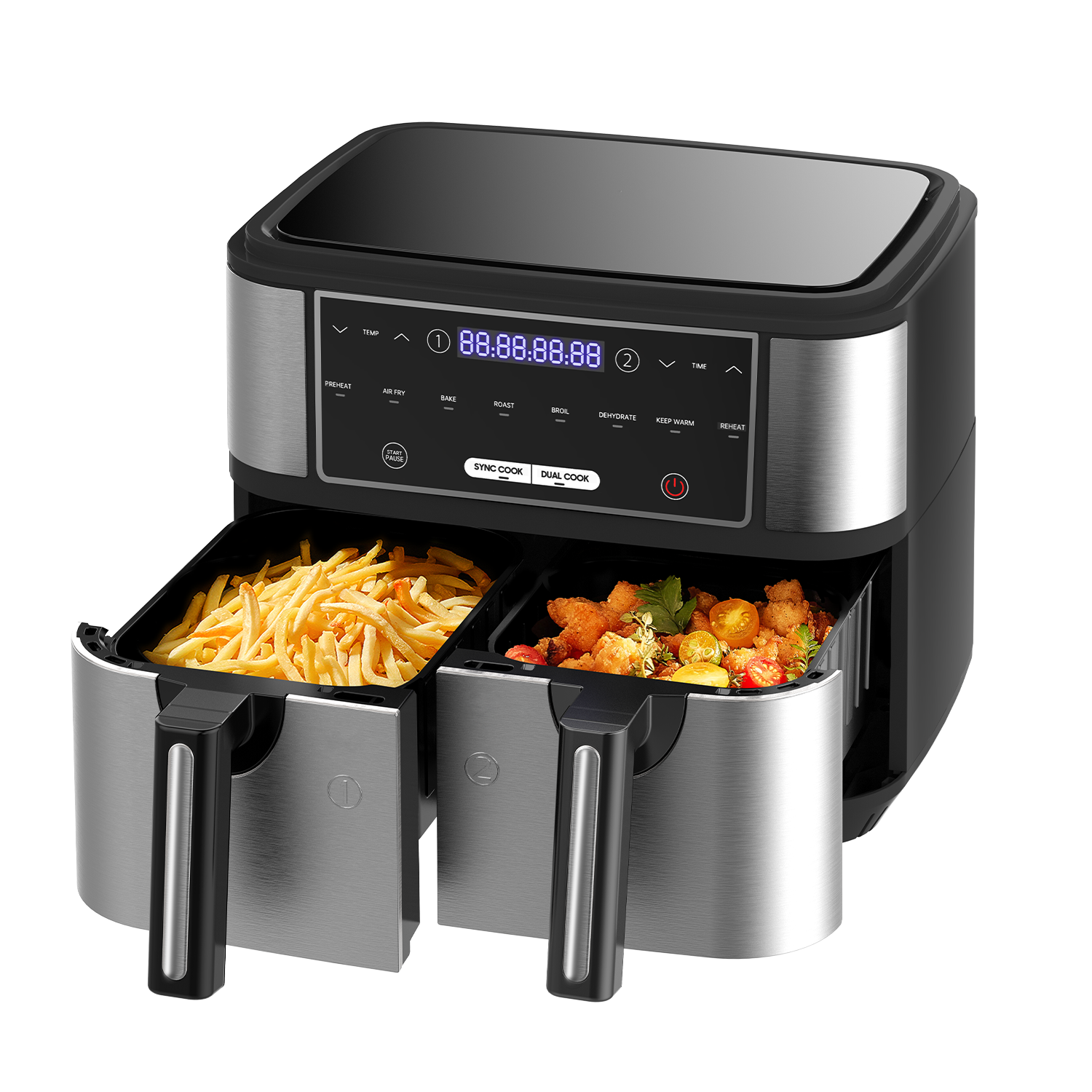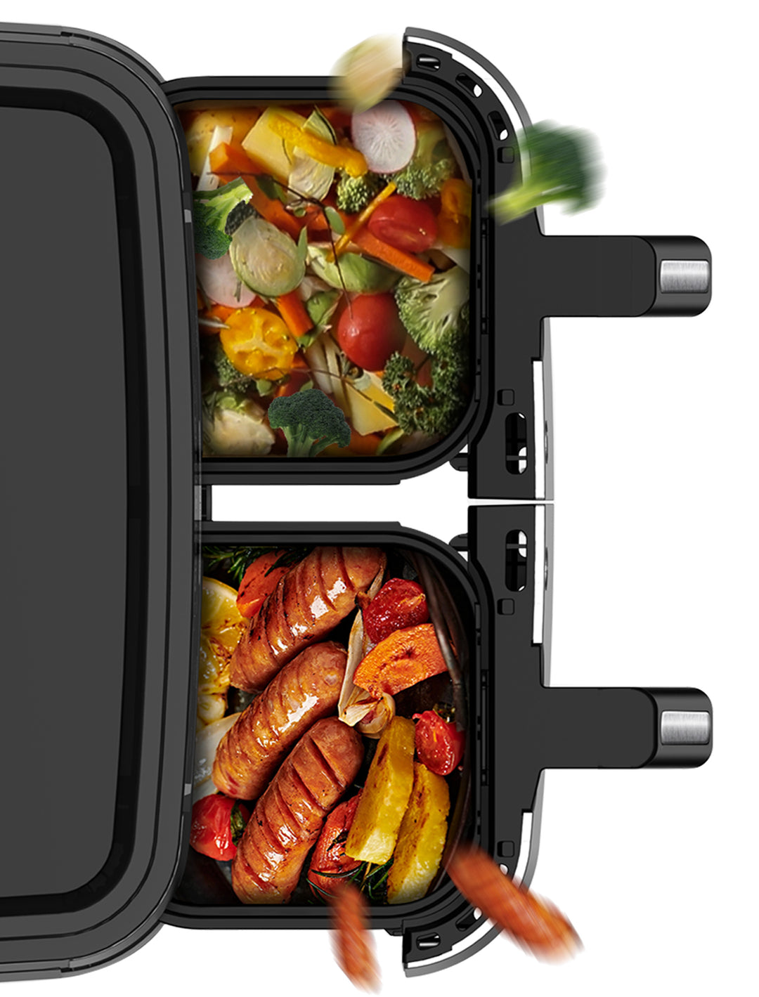 Haz tu vida más fácil con la freidora de aire de doble cámara de 4,5 litros + 4,5 litros y 8 programas preestablecidos. También es posible ajustar el tiempo y la temperatura según tus necesidades y así preparar tu plato favorito.