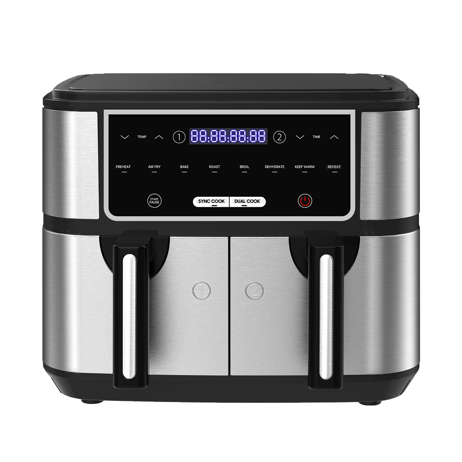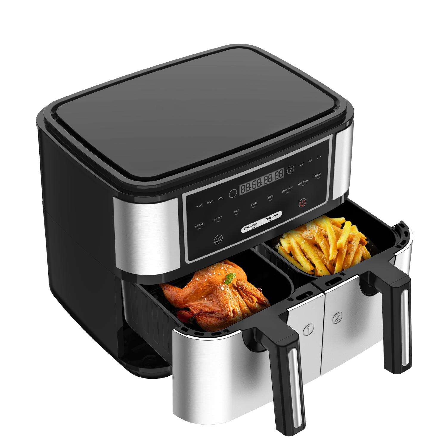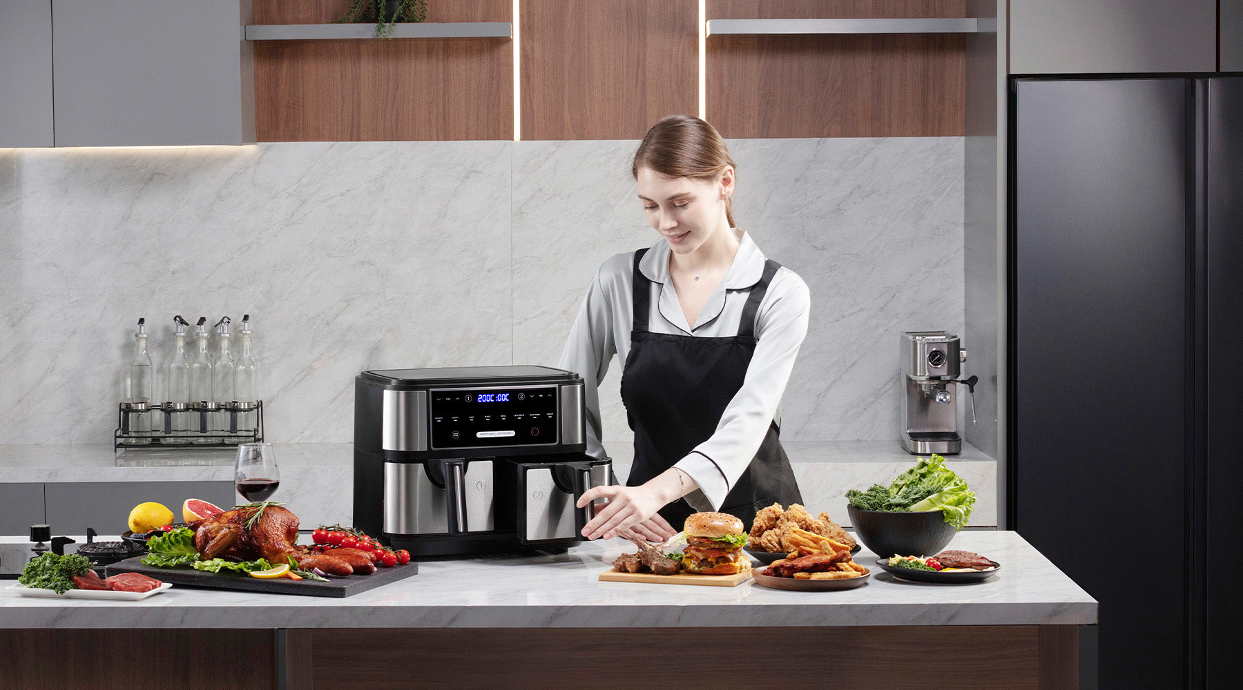Haz tu vida más fácil con la freidora de aire de doble cámara de 4,5 litros + 4,5 litros y 8 programas preestablecidos. También es posible ajustar el tiempo y la temperatura según tus necesidades y así preparar tu plato favorito.