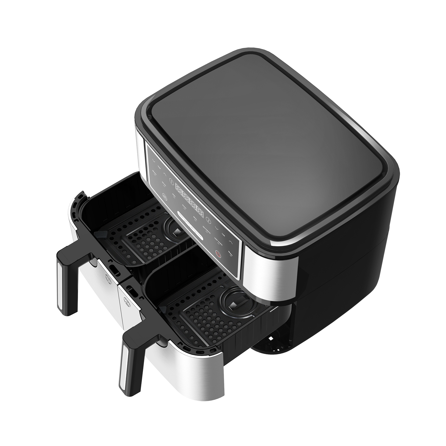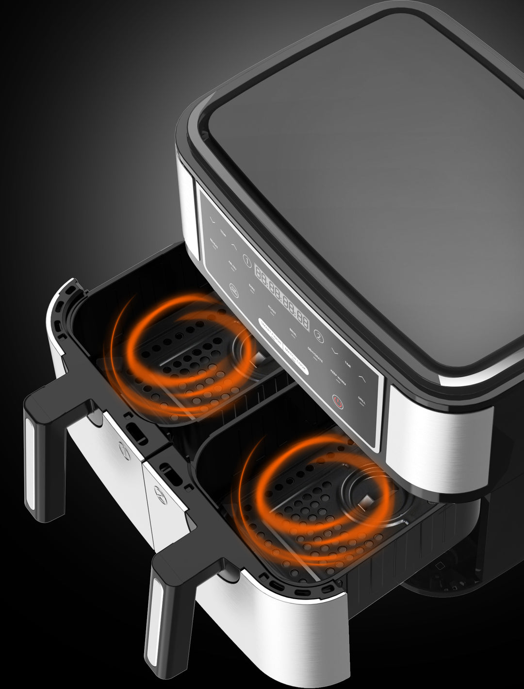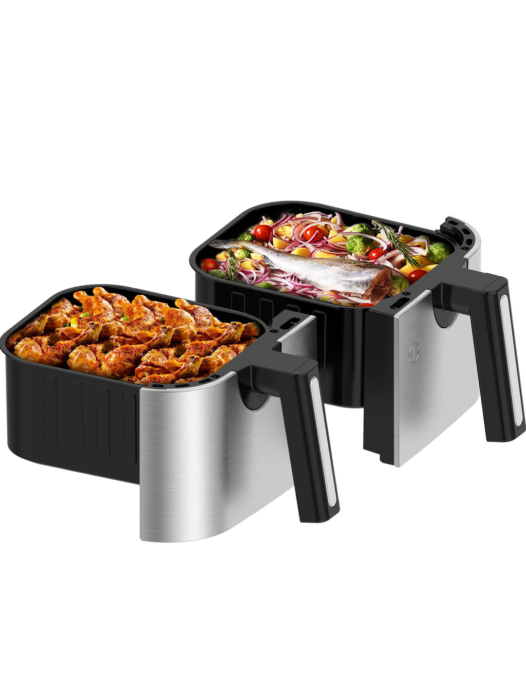 La Airfryer ofrece un generoso volumen de 9 litros, divididos en dos cestas. Esto lo hace ideal para preparar comidas para 6 a 8 personas.