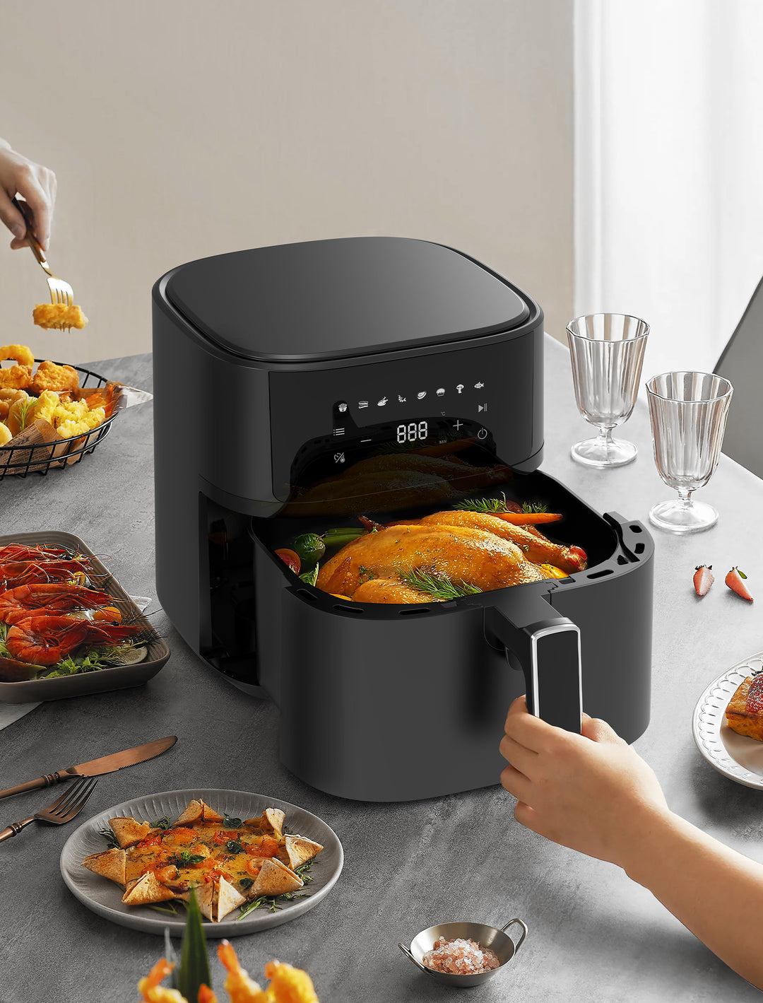 Elija entre 8 funciones de cocción preprogramadas para pizza, pescado frito, pan, pollo, bistec, patatas fritas, frutos secos y más. Versatilidad y comodidad con solo tocar un botón.