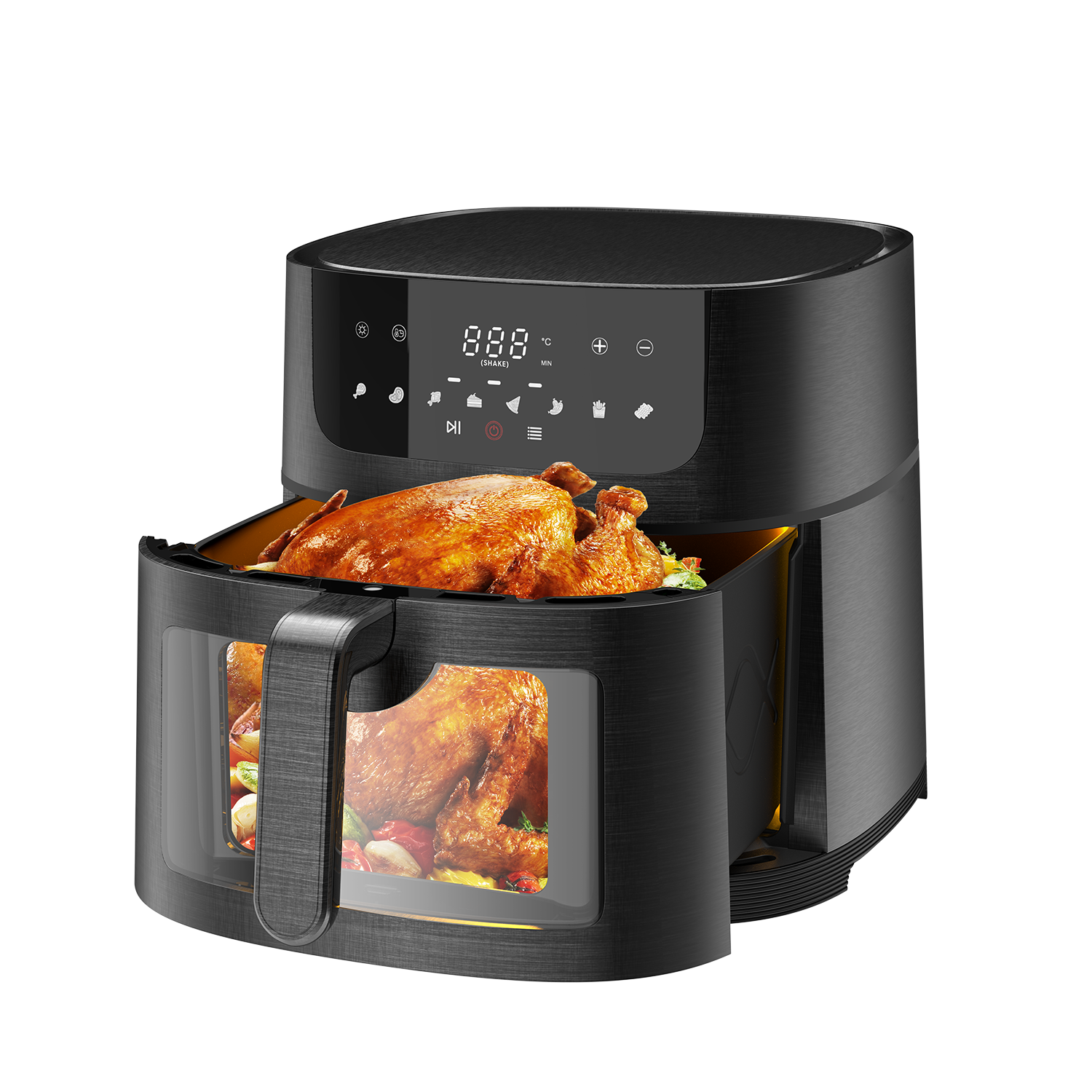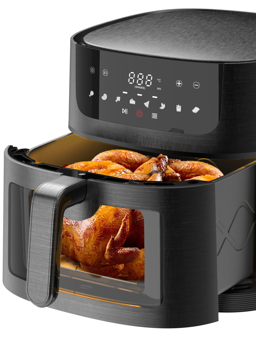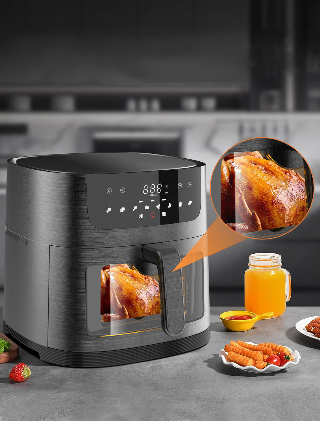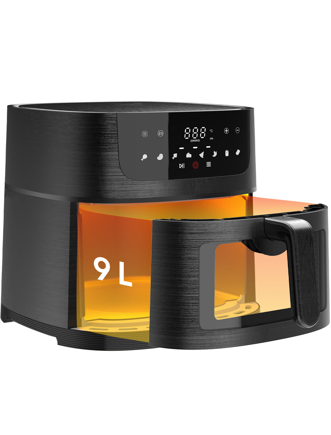 - Gran ventana de visualización transparente: La air fryer incluye una gran ventana transparente con luz interior. Puede controlar el estado de cocción en tiempo real, eliminando el riesgo de cocción excesiva y garantizando que sus platos estén perfectamente cocinados al nivel deseado de textura crujiente