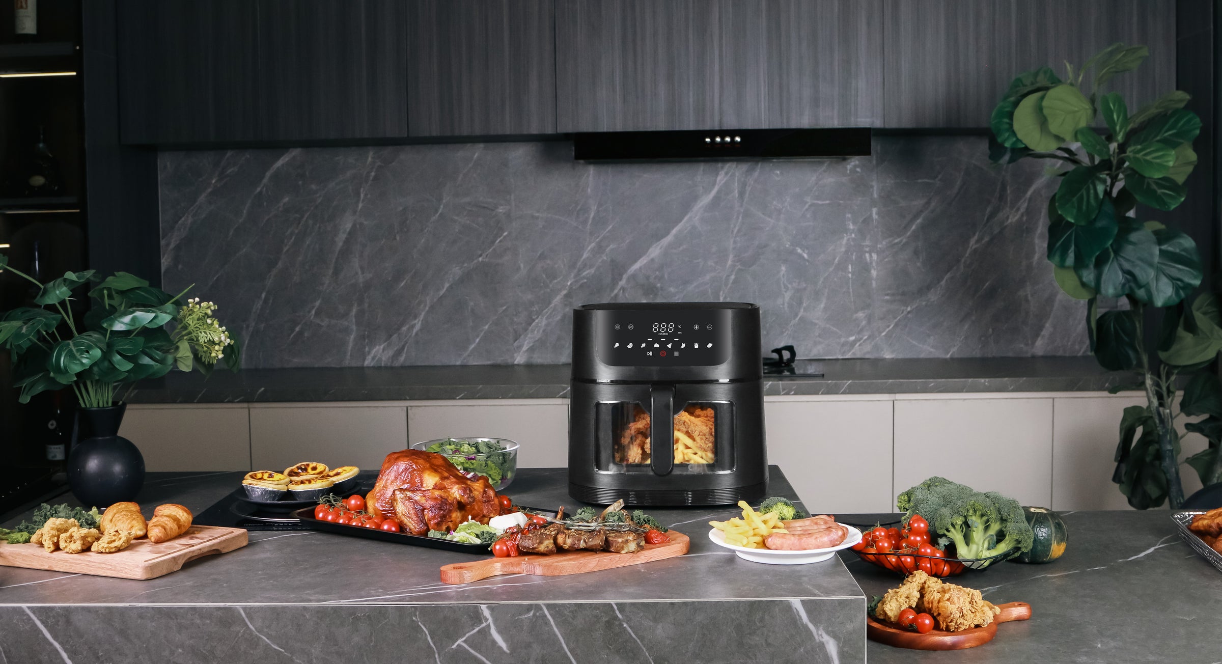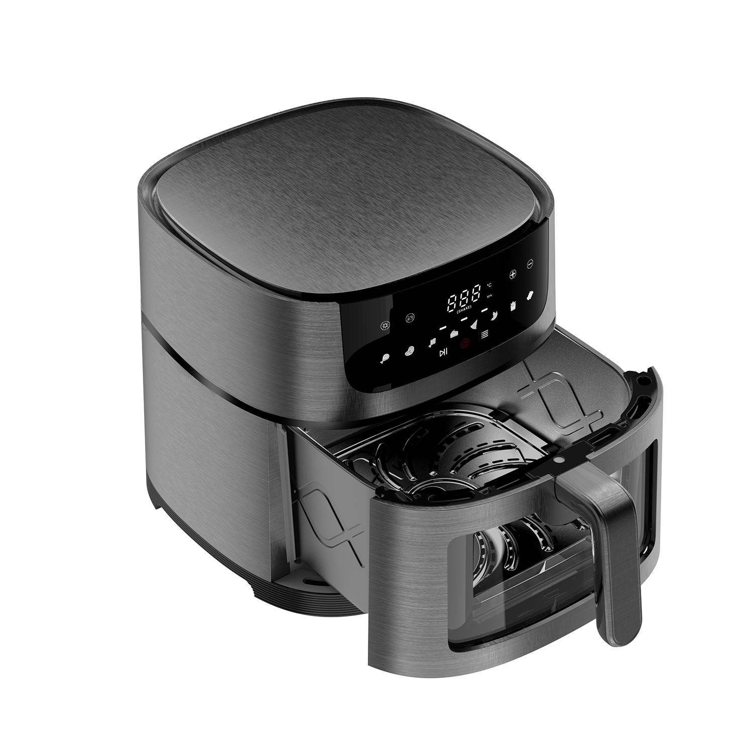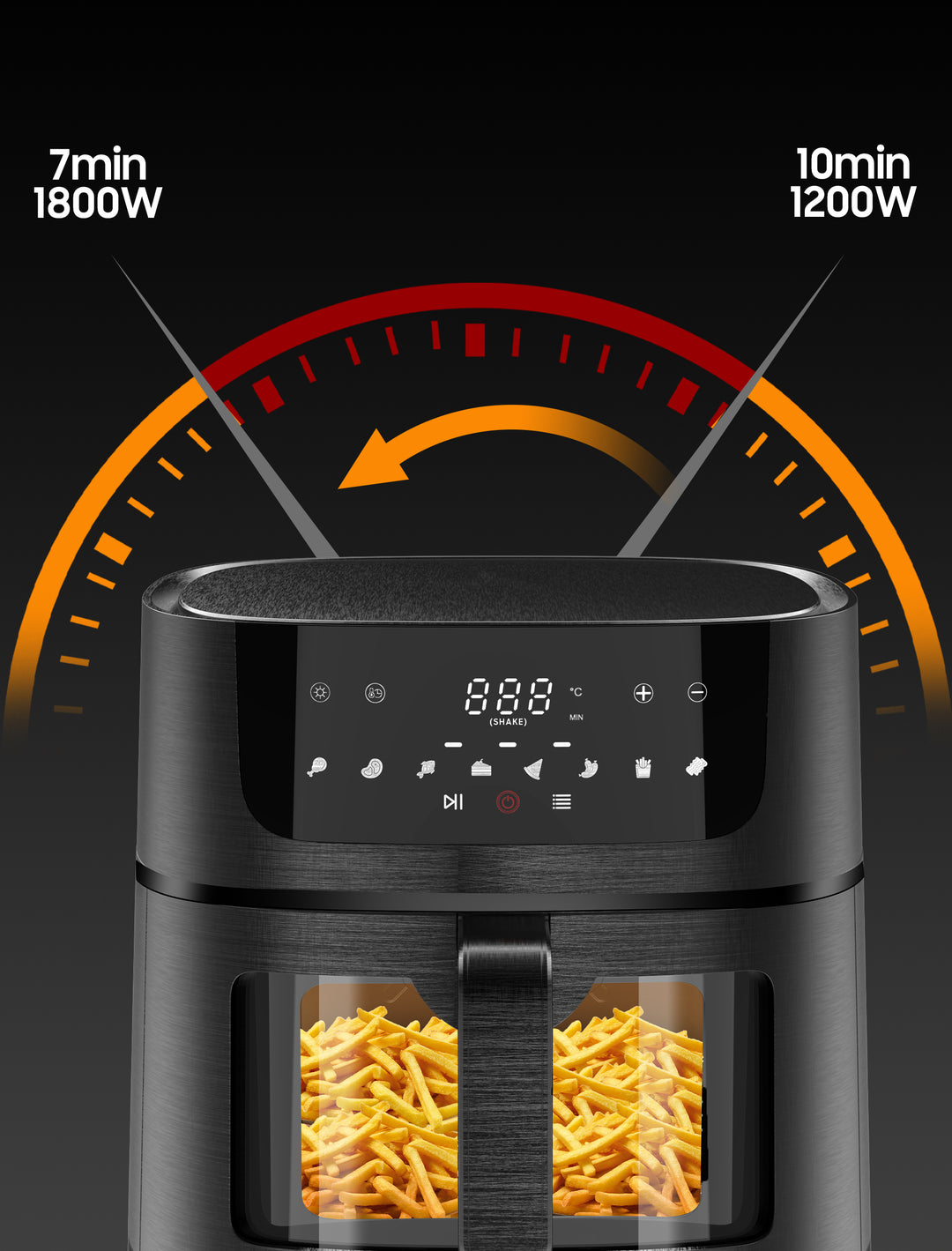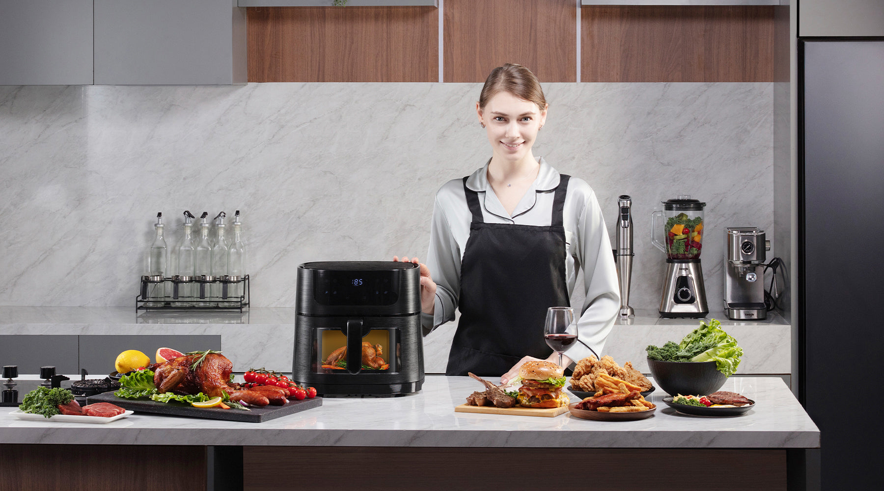 - Gran ventana de visualización transparente: La air fryer incluye una gran ventana transparente con luz interior. Puede controlar el estado de cocción en tiempo real, eliminando el riesgo de cocción excesiva y garantizando que sus platos estén perfectamente cocinados al nivel deseado de textura crujiente