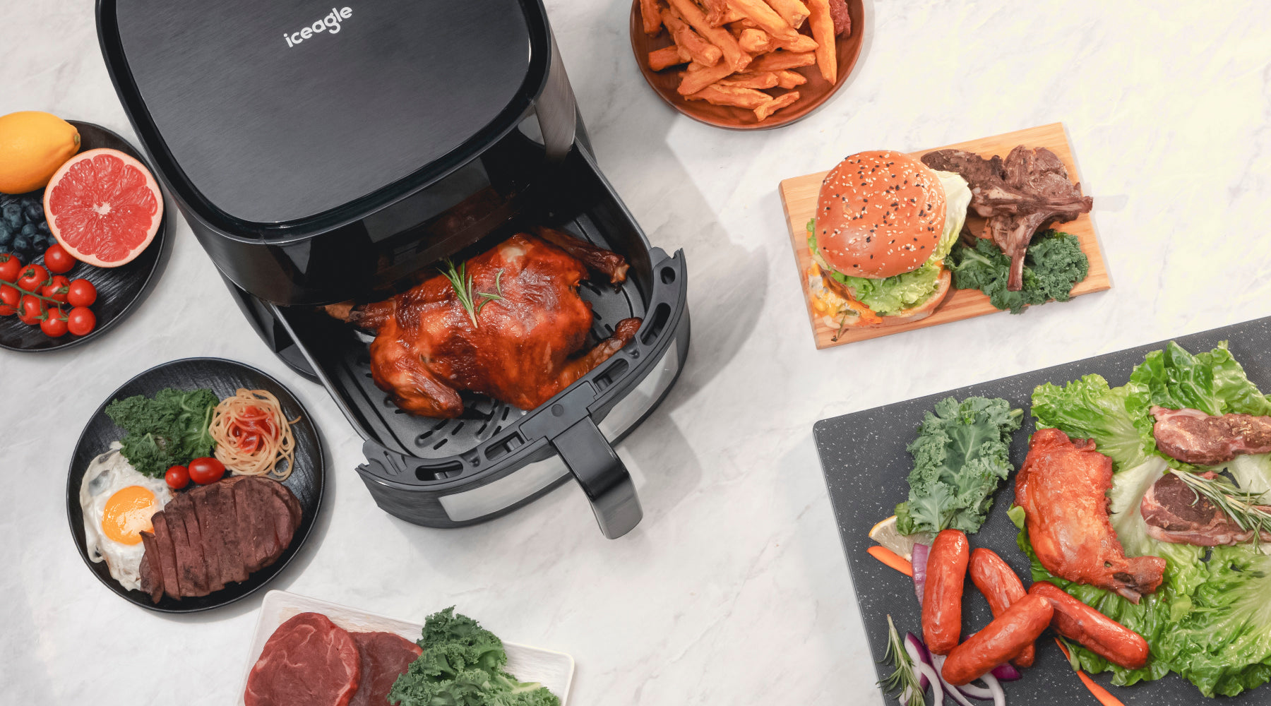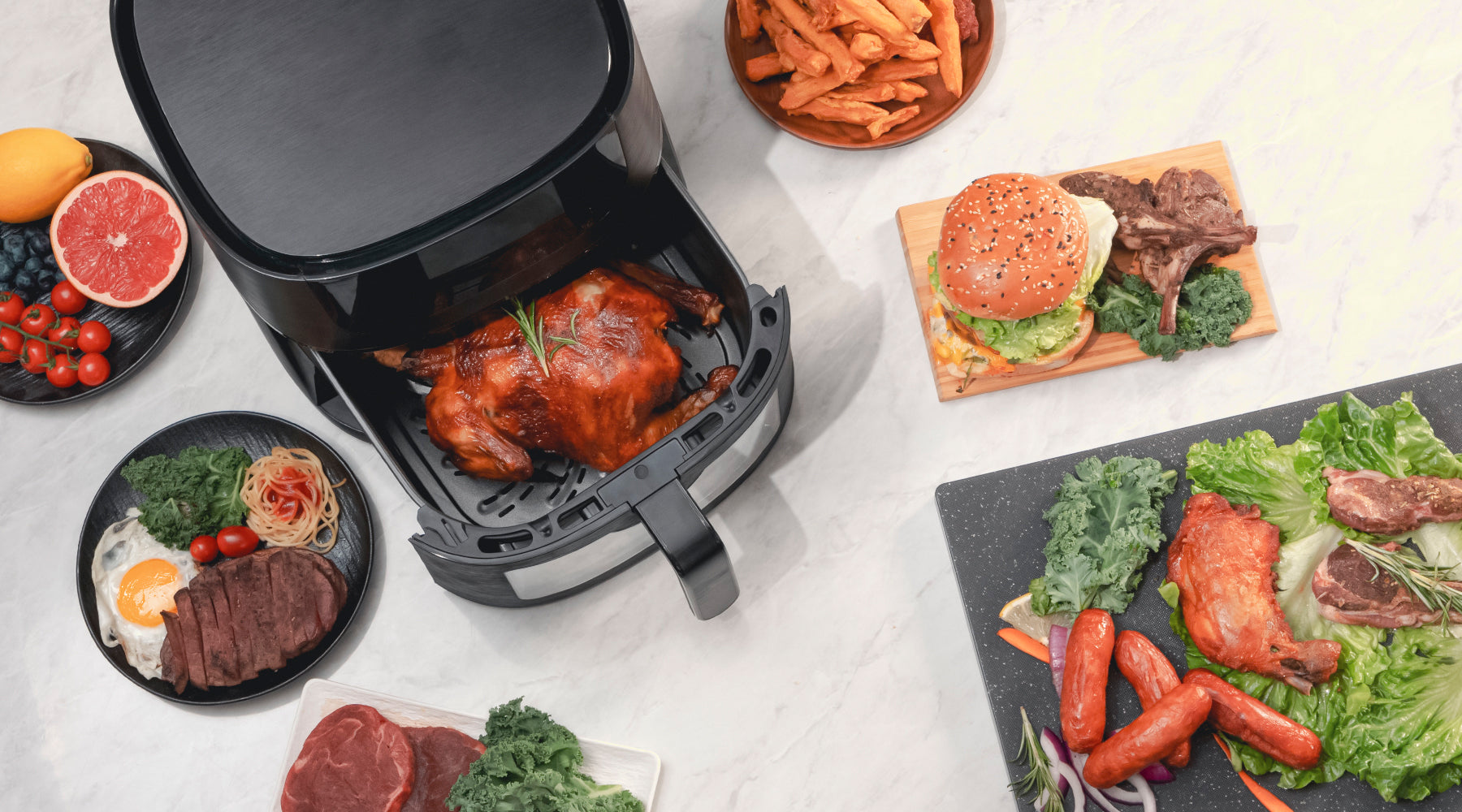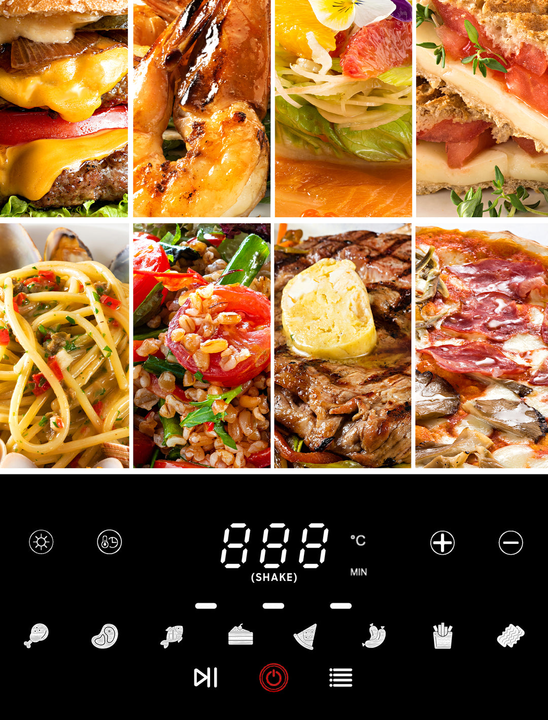 - Multifunciones 8 en 1: muslo de pollo, filete, pescado, pastel, pizza, salchicha, patatas fritas y tocino.