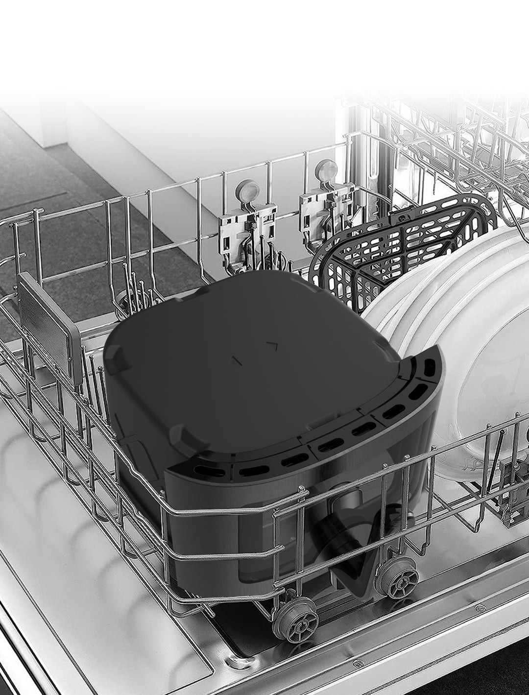 - Fácil de limpiar: La cesta tiene un revestimiento antiadherente. La bandeja antiadherente extraíble mantiene la comida alejada del suelo y permite la circulación del aire. ¡Ambos aptos para lavavajillas!