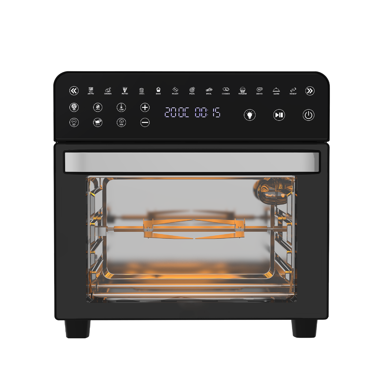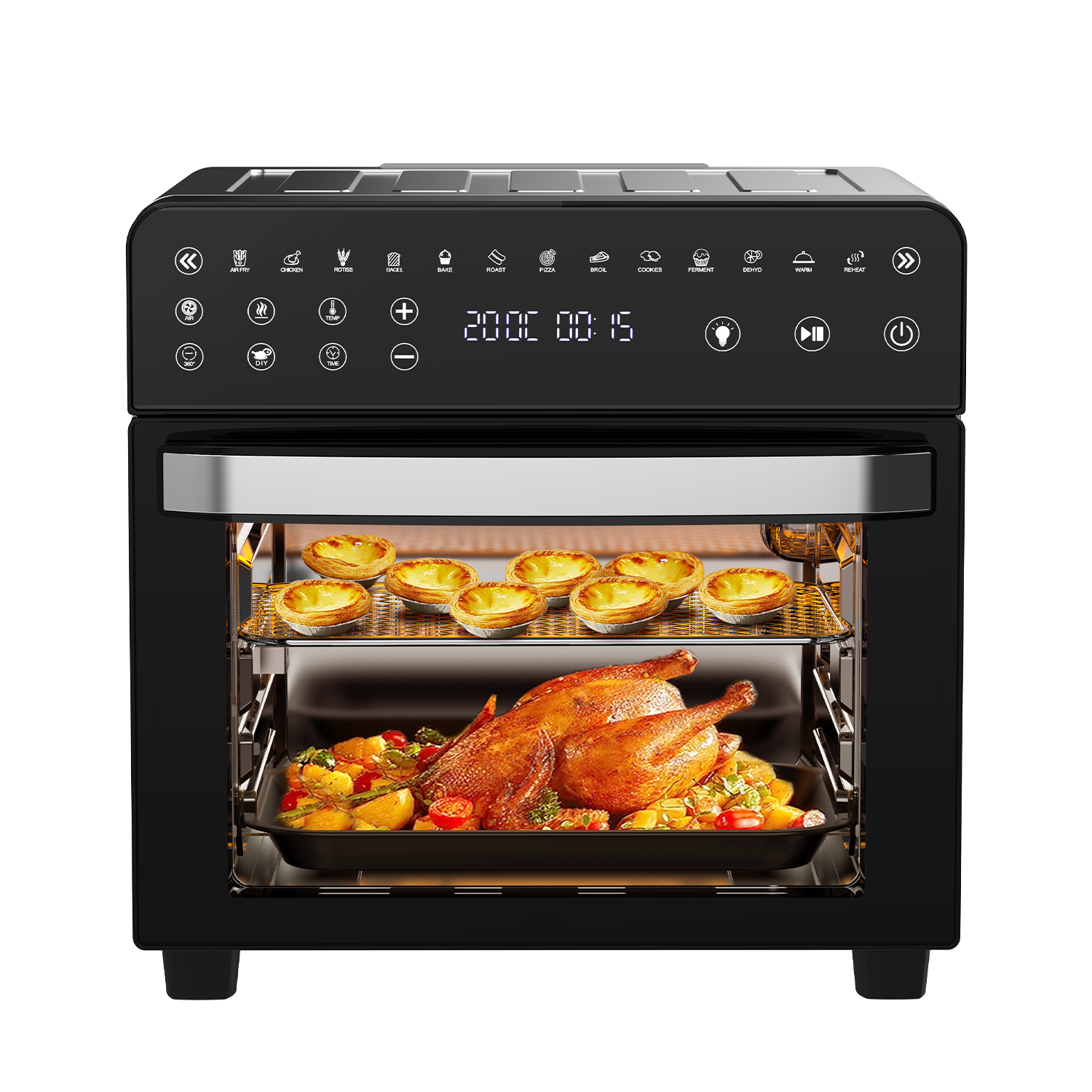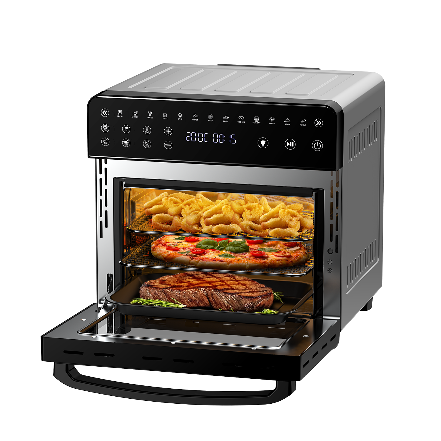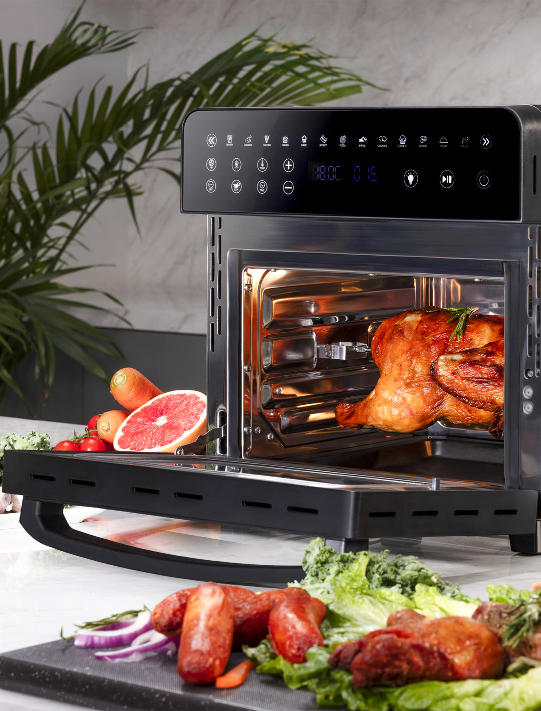 • Capacidad de 15 litros: Con una generosa capacidad de 15 litros, este aparato ofrece suficiente espacio para preparar grandes cantidades de alimentos. Puedes cocinar sin problemas pollos enteros, pizzas u otros platos que requieran una mayor superficie de cocción.