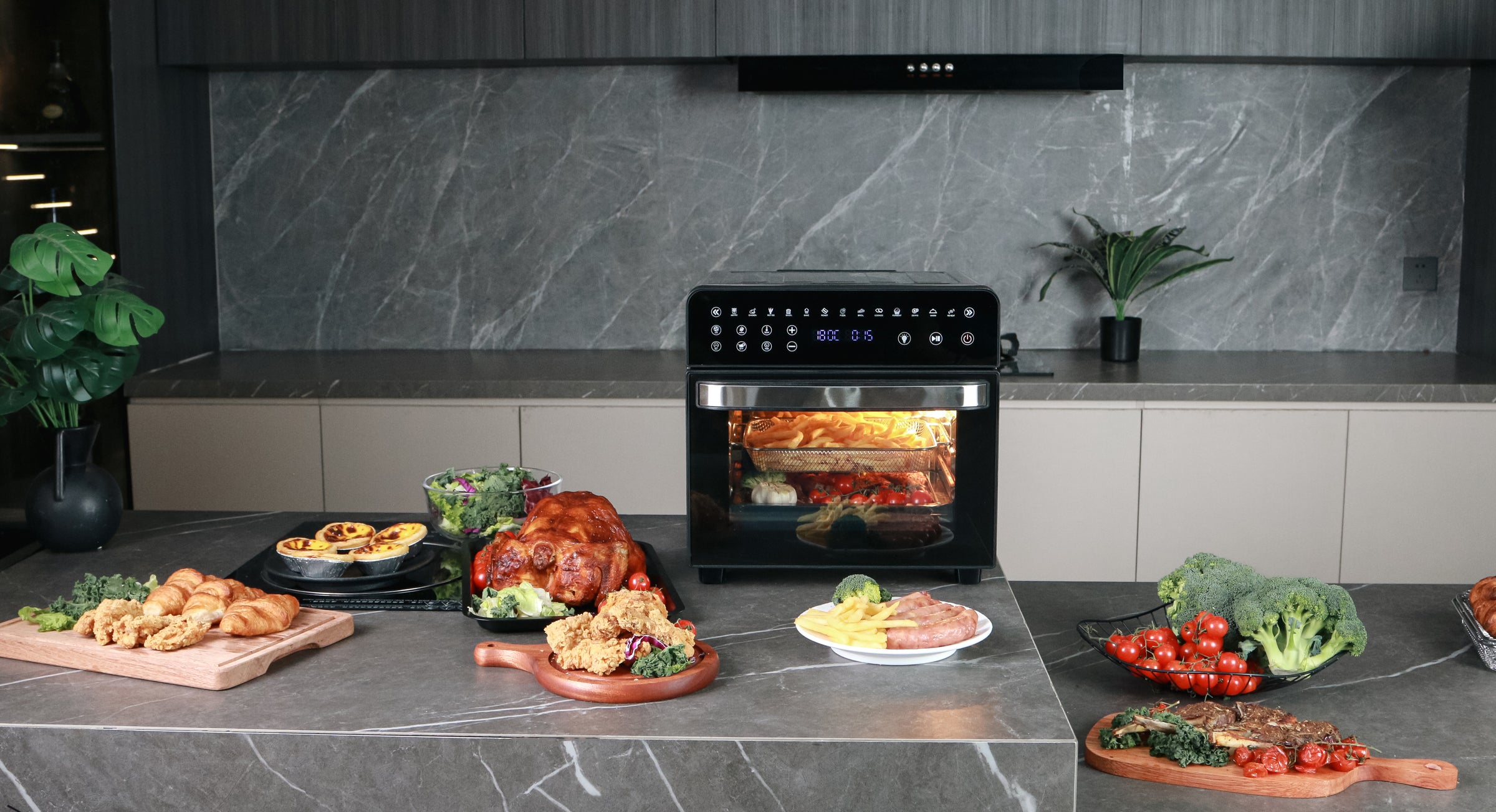 • Pantalla LED especialmente inclinada: La sencilla y inteligente pantalla LED permite un control más preciso del tiempo y la temperatura en comparación con los hornos convencionales. La pantalla digital facilita el seguimiento de los tiempos de cocción y la función de recordatorio LED asegura una cocción uniforme de los alimentos.