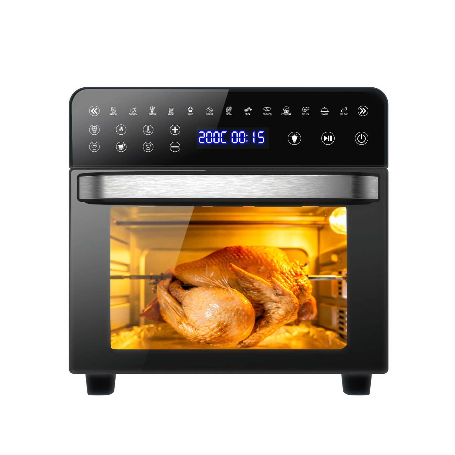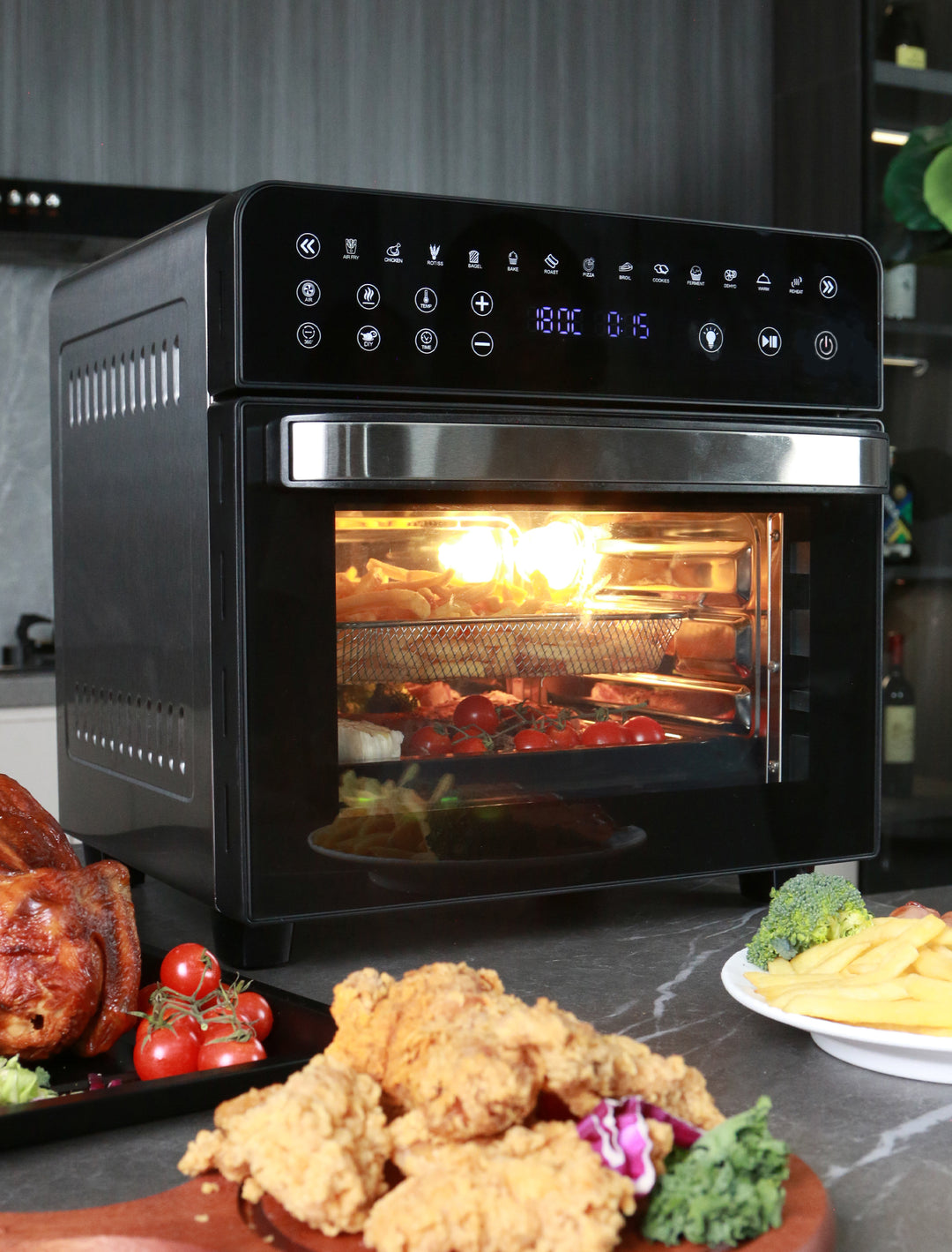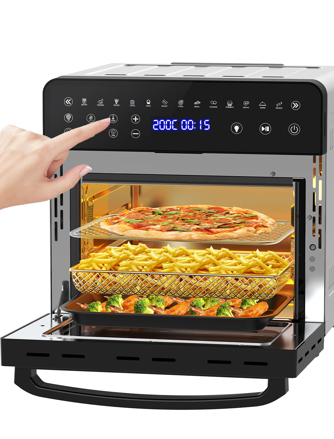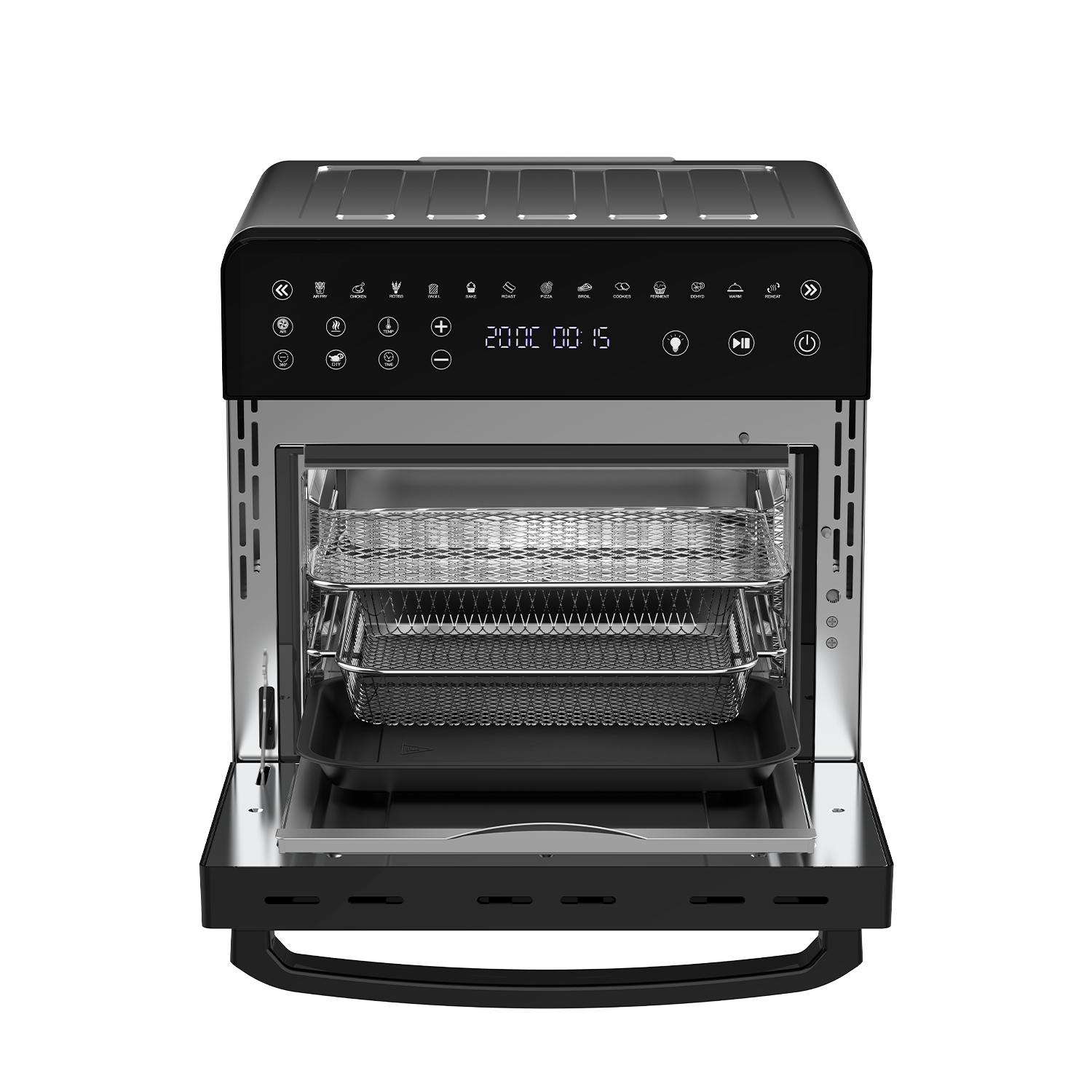 • Capacidad de 15 Litros: Perfecta para preparar pollos enteros, pizzas u otros platos que requieren una mayor superficie de cocción.
