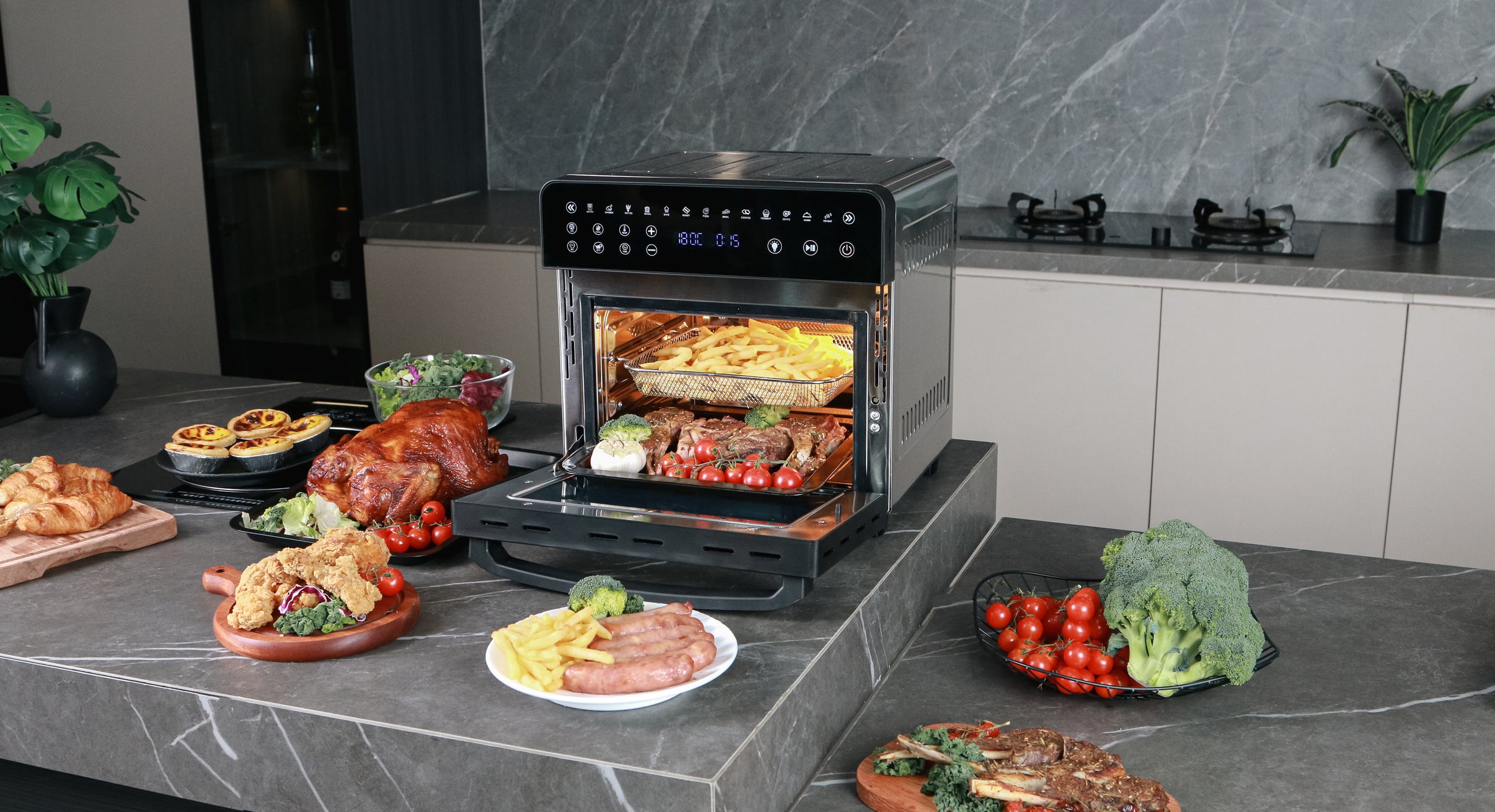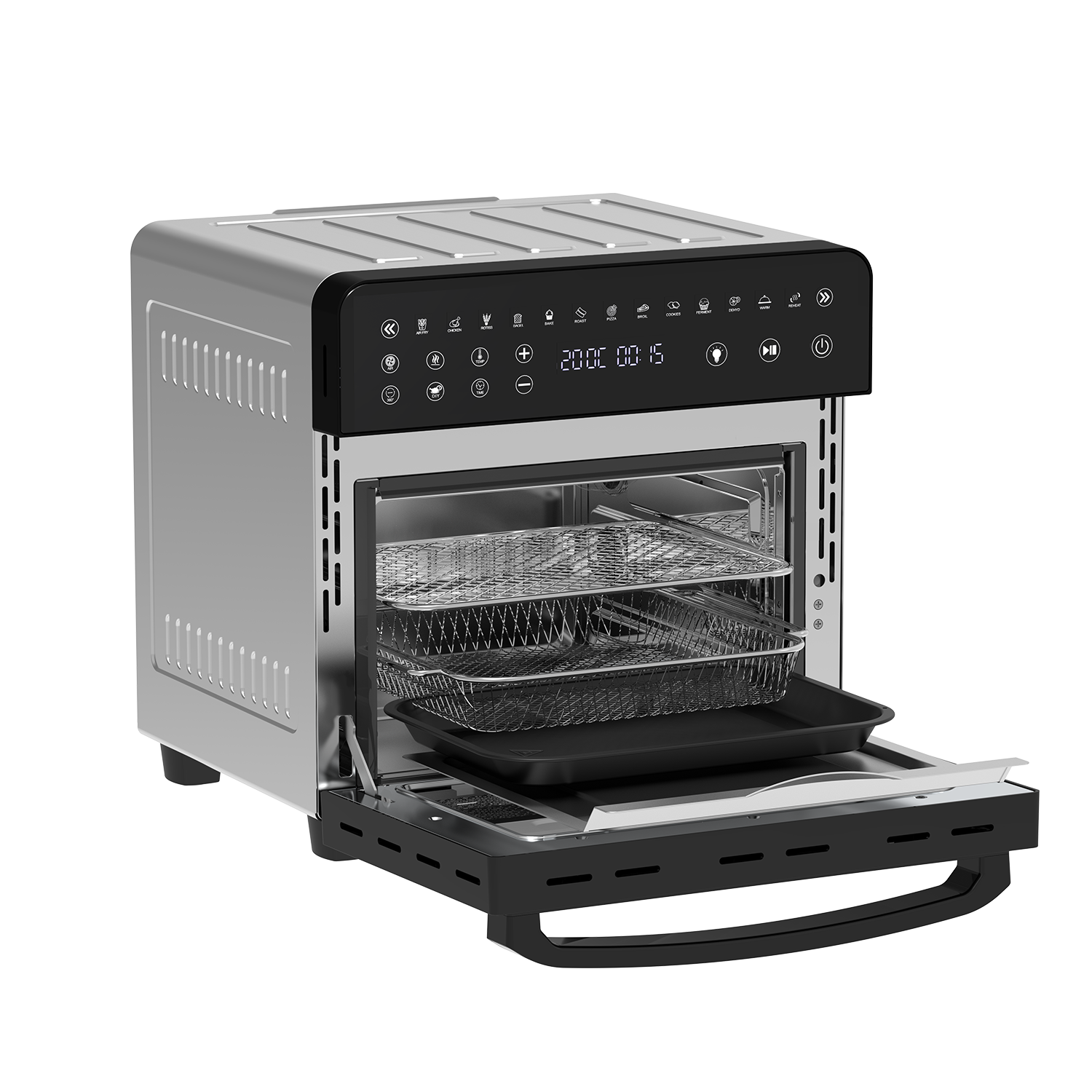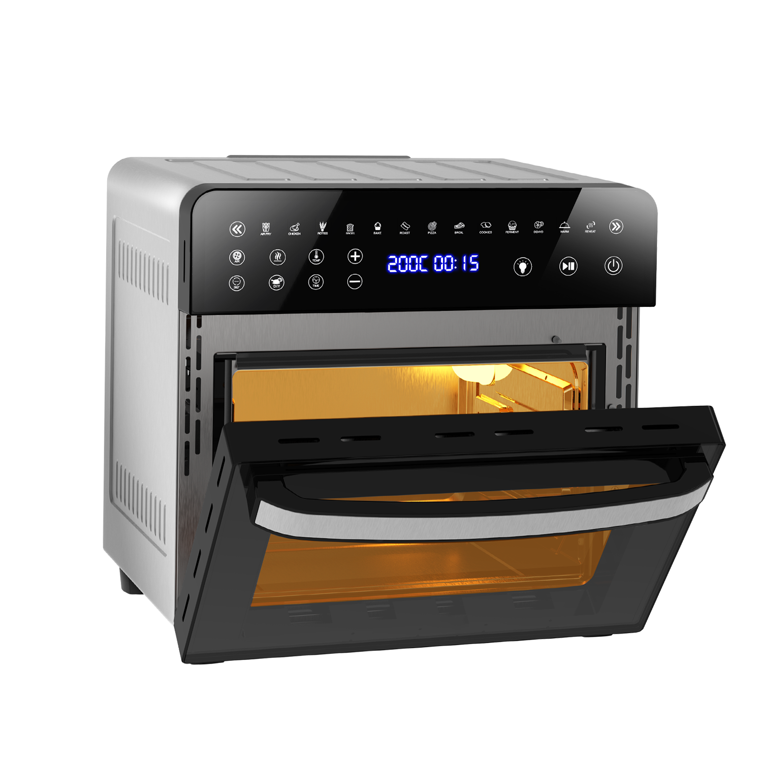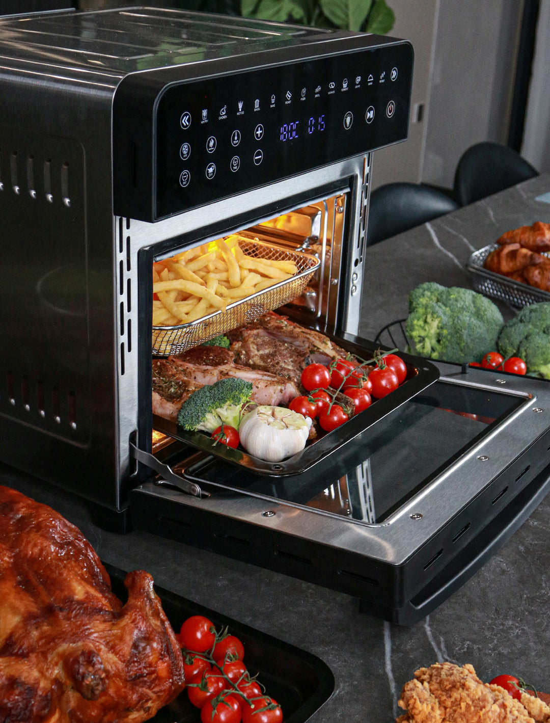 • Capacidad de 15 Litros: Perfecta para preparar pollos enteros, pizzas u otros platos que requieren una mayor superficie de cocción.