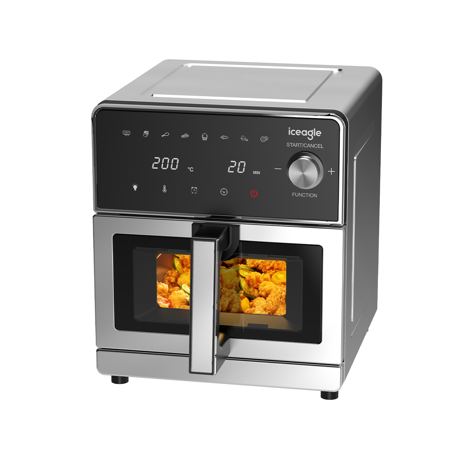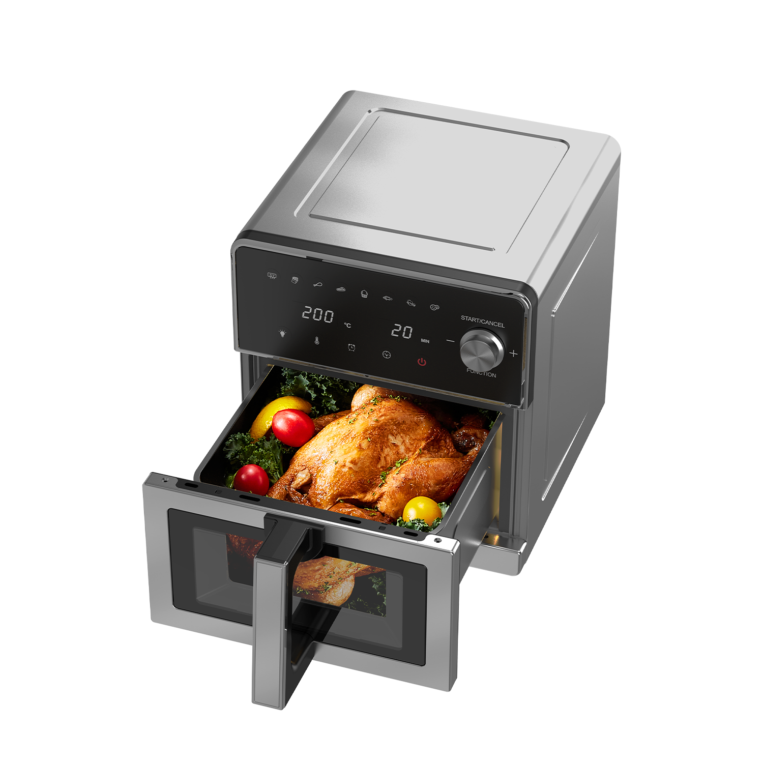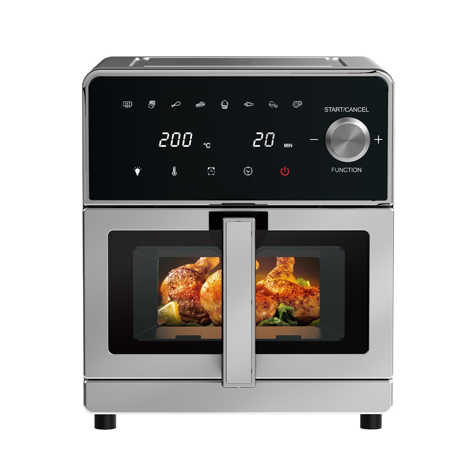 - Ventana de Visualización Grande: La ventana de visualización grande de la freidora de aire le permite controlar el proceso de cocción sin necesidad de abrir la freidora, lo que conserva el calor y garantiza resultados uniformes. Esta práctica función le permite controlar fácilmente el progreso de sus alimentos, lo que ayuda a evitar que se cocinen demasiado o se quemen
