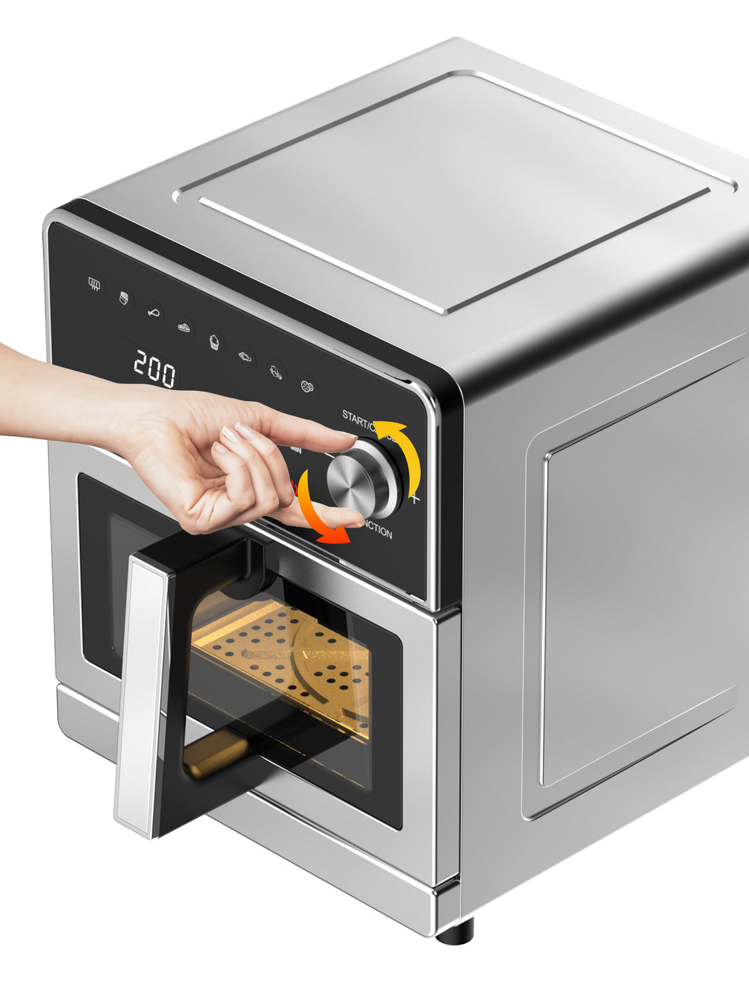 - Pantalla LED Fácil de Usar: Esta airfryer cuenta con una pantalla LED intuitiva y fácil de usar para un funcionamiento perfecto. Puede cambiar entre programas de cocción de dos maneras: presionando el ícono correspondiente o girando la perilla para una selección precisa. Todos los íconos funcionan como botones que se pueden presionar, lo que facilita el ajuste de las configuraciones para obtener resultados de cocción óptimos con solo un toque o un giro