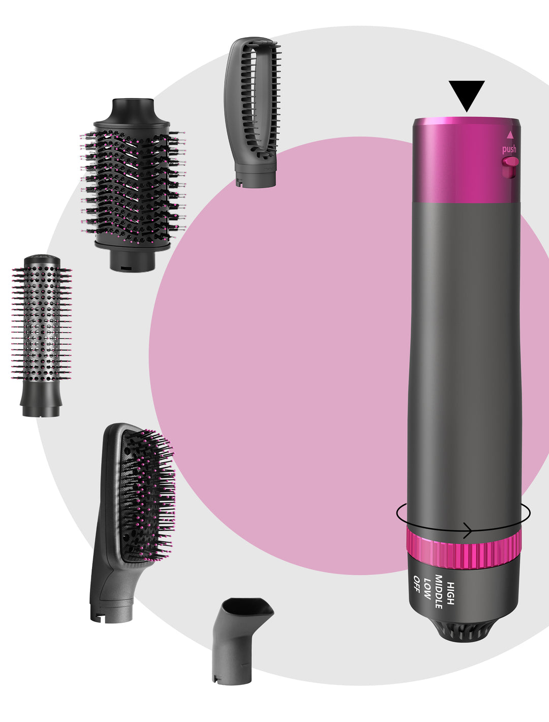 Descubra el poder de 5 funciones en un solo cepillo de aire caliente. Esta maravillosa herramienta combina alisado, rizado, volumen, peinado y secado en un solo producto para lograr infinitas posibilidades de peinado.